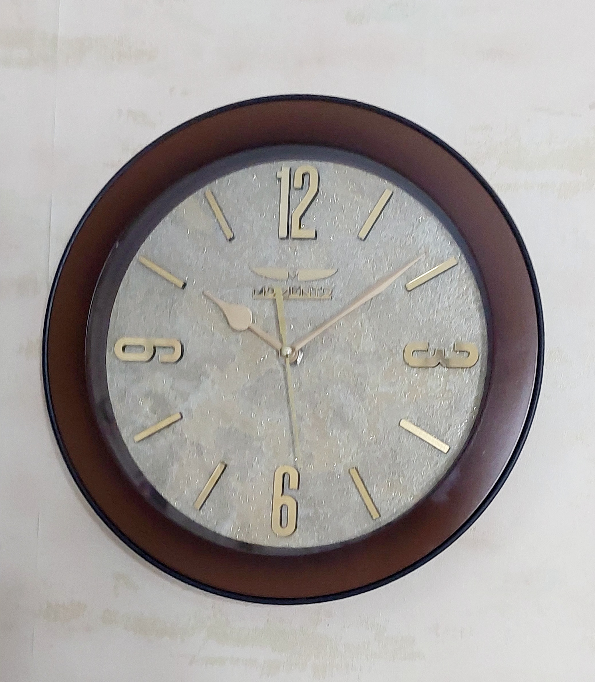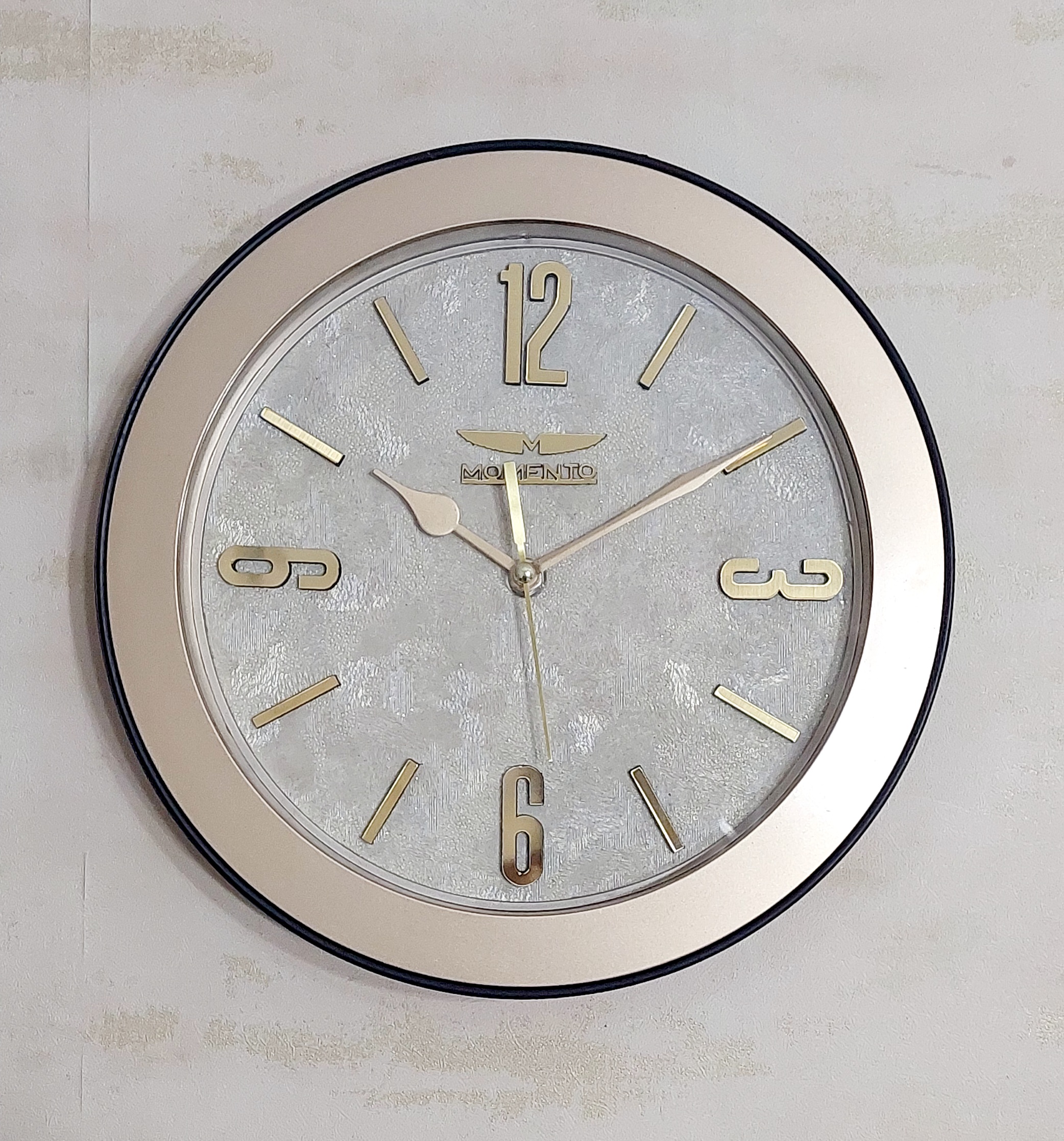 ساعت دیواری مومنتو باسایز قطر بیرونی 27.5 سانتیمتر و ارتفاع ازسطح دیوار 4.5 سانتیمتر و باطراحی درعین حال ساده بسیار شیک و کلاسیک دارای موتوری آرامگرد و بیصدا مناسب برای مکانهایی چون اتاق خواب ،اتاق پذیرایی، محل کار ویا دفاتر شرکتها و مطب پزشکان مناسب می باشد مصرفی این موتور سالی یک عدد باطری قلمی آلکالین می باشد بهتره این ساعت را در معرض وسایل حرارتی و رطوبتی نگذارید